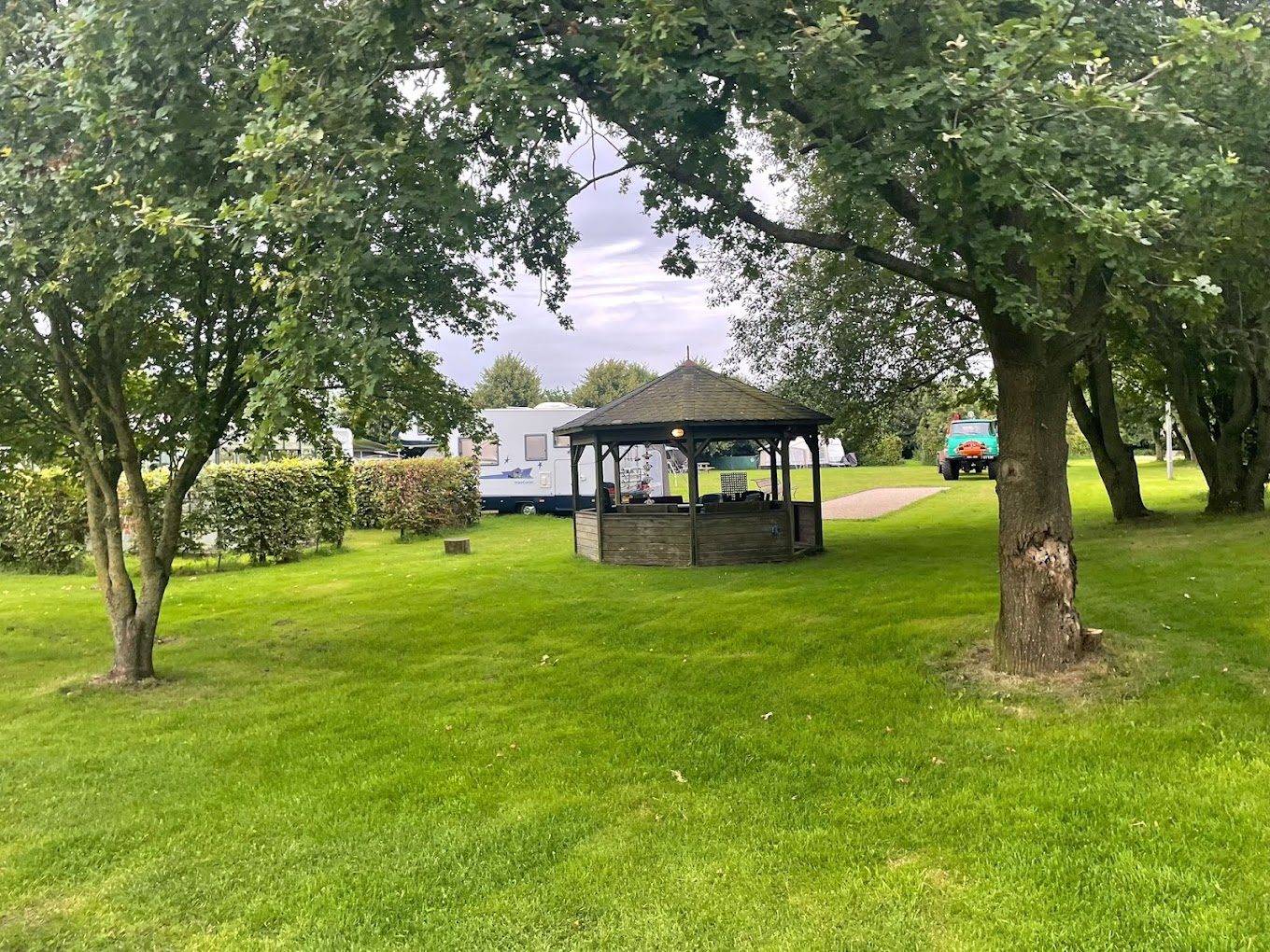 Ons terrein is landschappelijk ingericht met een vijver, een natuurvriendelijke oever, boomgaard, poelen en een dijk waar u overheen kunt wandelen en een prachtig uitzicht zult vinden. Geniet van het weidse uitzicht.
